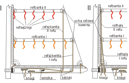 - refsejzingi - linki przechodzące przez remizki do wiązania żagla do bomu,